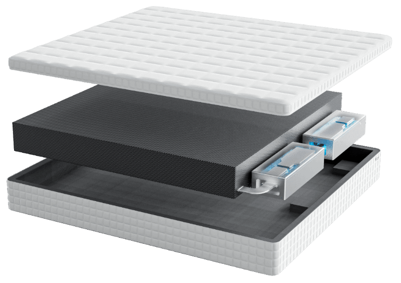 The HEKA AI Mattress is composed of a skin-friendly layer, the HEKA AI Core System (located at the foot of the bed) and HEKA AI Elastic Smart Columns.